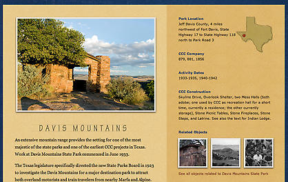 Profiles of all the CCC parks draw upon the database-driven online archive, enabling users to explore the artifacts, buildings, and people of the Texas CCC. An interactive map lets users see where parks are in proximity to each other and possibly to the user's home, encouraging them to get out and see the parks themselves.