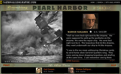 Built to commemorate the 60th anniversary of the attack on Pearl Harbor, the website carefully chronicles the hours and minutes leading up to the attack. An "attack map" shows where each strike hit the harbor and when. Choosing to Learn More about each event, visitors access interviews with both American and Japanese witnesses, illustrated by historical images. The highly interactive map lets the visitor learn more about each ship that was in the harbor that day—from the smallest utility vessel to massive aircraft carriers like the USS Arizona—detailing the experiences and losses of each.